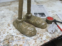 Dada la forma con alambre, emepzamos a rellenas con periodico, para mayor sujetavilidad, hacemos las piernas con madera y luego las cubrimos con cartón. No olvidar ponerle peso en la planta de los pies para estabilizar...